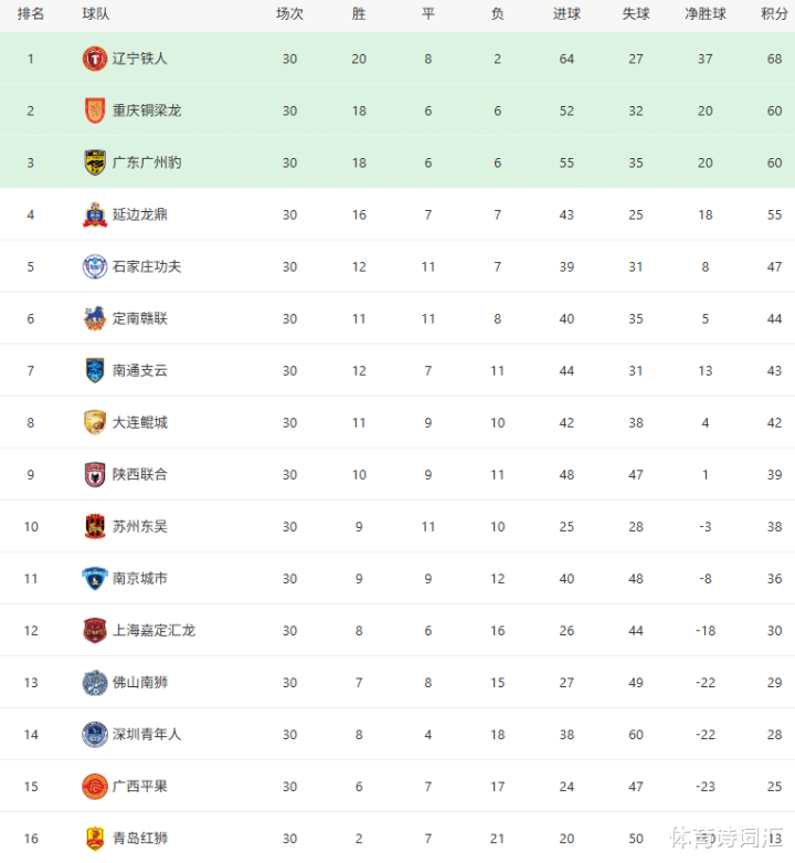 至此,2025赛季中甲联赛总排名如下:1、辽宁铁人68分【夺冠升超】;2、重庆铜梁龙60分【升超】;3、广东广州豹60分;4、延边龙鼎55分;5、石家庄功夫;6、定南赣联;7、南通支云;8、大连鲲城;9、陕西联合;10、苏州东吴;11、南京城市;12、上海嘉定汇龙;13、佛山南狮29分;14、深圳青年人28分;15、广西平果25分【降级】;16、青岛红狮13分【降级】。